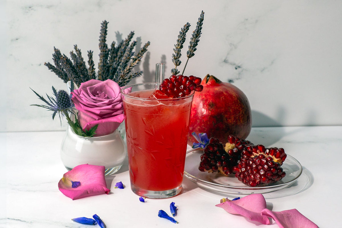 Garnish with dried lavender spikes and a cluster of pomegranate seeds. Add optional straw. Serve and enjoy!