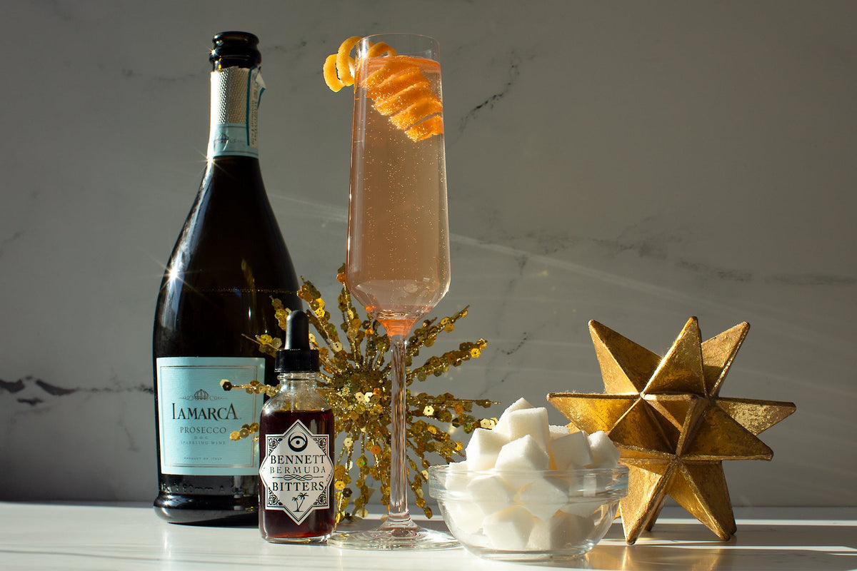 Champagne - Traditionally aged for a minimum of 15 months, Champagne is on the drier side for bubbly. Because of this, a Pink Champagne Cocktail made with Champagne will be a bit more dry than if it were made with a sweeter, sparkling, wine like Prosecco. If you're the kind of person who finds yourself saying “not too sweet” any time you place a drink order, this option might be for you. Champagne tends to have delicious notes of toasted bread and almond which blend marvelously well with the banana and cinnamon in the Bermuda Bitters.